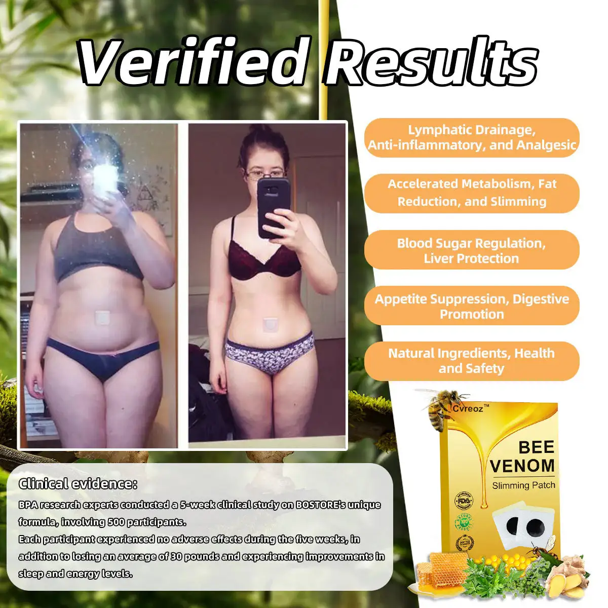 I combined various botanical ingredients to create Cvreoz™ Bee Venom Slimming Patch, which has garnered acclaim for its benefits to the lymphatic system and metabolic health. This herbal navel patch has been proven to be the optimal choice for treating lymphatic issues. The combination of these ingredients, along with the potent properties of bee venom, provides a breakthrough solution for rapidly addressing metabolic disorders and lymphatic congestion.