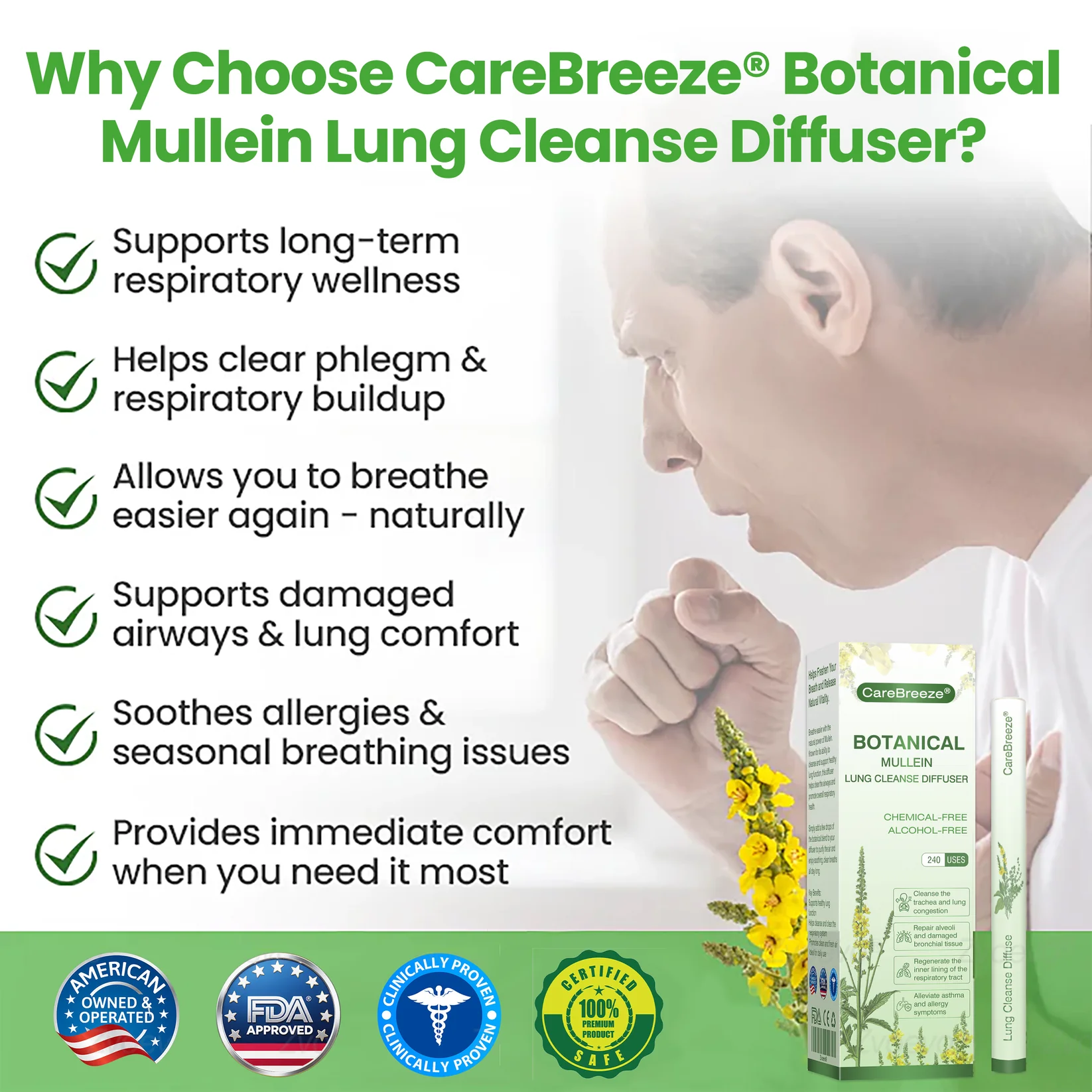“The CareBreezeยฎ Botanical Mullein Lung Cleanse Diffuser has completely transformed my respiratory health. After years of smoking and vaping, my lungs were constantly congested. I struggled with shortness of breath, persistent coughing, and excessive phlegm. Even with doctor-prescribed medications, the relief was only temporary. But within just five days of using the CareBreezeยฎ diffuser twice daily, I noticed a dramatic difference. My breathing felt easier, and the stubborn congestion started clearing. By the third week, I was shocked at how effortlessly I could climb several flights of stairs without getting winded. This diffuser is a true lifesaver, and Iโm beyond thrilled with the results!” โย Ryan Mitchell, Age 67, Seattle, Washington