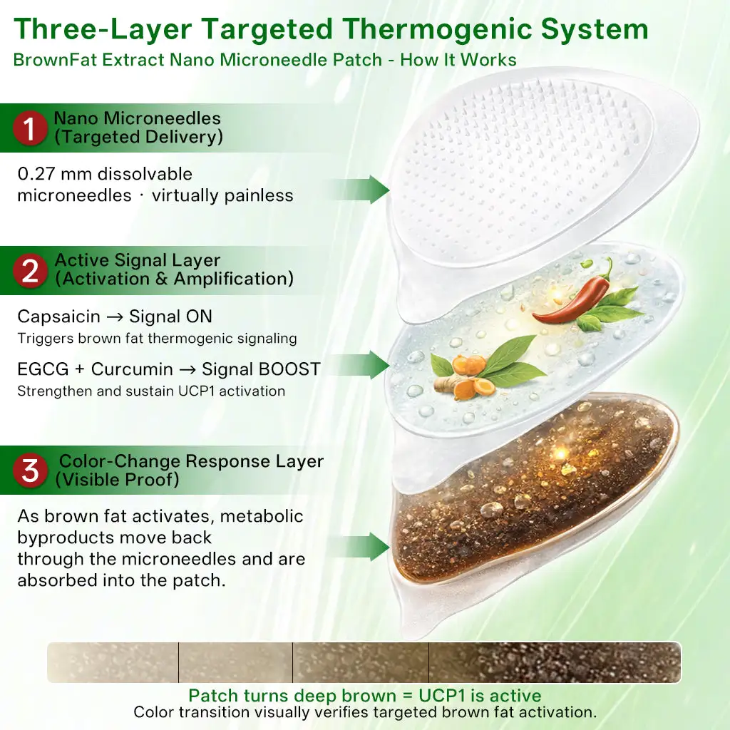 The BrownFat Extract Nano Microneedle Patch works through a smart, four-step brown fat activation system. Capsaicin acts as the activation signal, gently waking up brown fat cells and triggering UCP1, the protein responsible for fat-burning thermogenesis. EGCG and curcumin amplify and stabilize this signal, helping brown fat stay active longer while supporting efficient fat and energy use. Nano microneedles then deliver these signals directly to skin-adjacent fat tissue, ensuring precise, localized action without systemic spread. As UCP1-driven fat burning begins, the patch responds to heat and metabolic byproducts with a visible color change from clear to deep brown, providing real-time confirmation that brown fat is actively working. Together, this closed-loop system helps increase energy burn, support fat metabolism, and naturally regulate appetiteโmaking weight management both effective and visible.