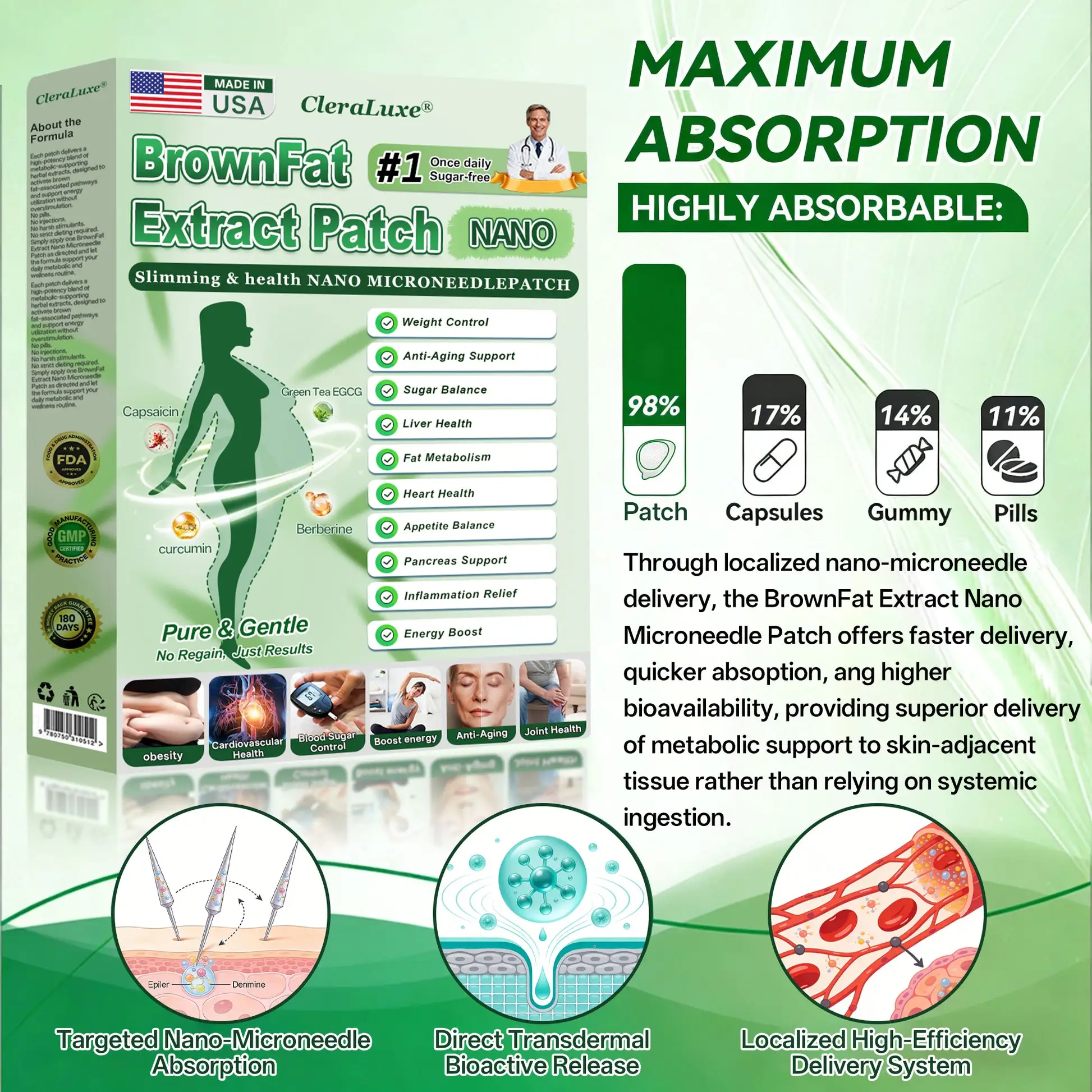 100% Natural Ingredients, Compatible with Other Medications, Visible Brown Fat Extraction Proof with Painless Nano Microneedle Technology