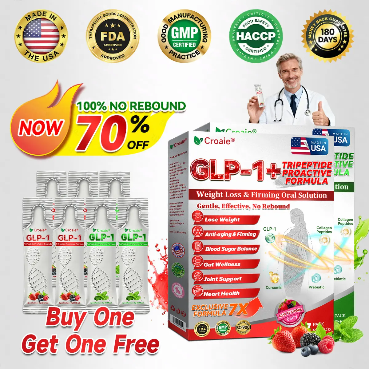 Clinically validated by endocrinologists, CroaieยฎGLP-1 + Collagen Peptides Oral Solution delivers visible improvements in obesity, skin firmness, and overall health within just 7 days.