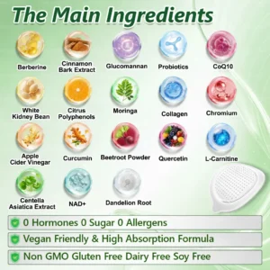 Apple cider vinegar powder, white kidney bean extract, and cinnamon extract work synergistically on carbohydrate metabolism and gut motility by reducing digestive enzyme activity and supporting hepatic and biliary detoxification and bile flowโpromoting fat digestion, nutrient absorption, and endotoxin clearance to maintain a more balanced intestinal environment. Moringa, green tea extract, and coriander seed extract, rich in natural polyphenols, help inhibit pathogenic bacteria, support the expansion of beneficial probiotics, and enhance microbiome diversity, improving bloating, irregular bowel movements, and overall digestive discomfort.