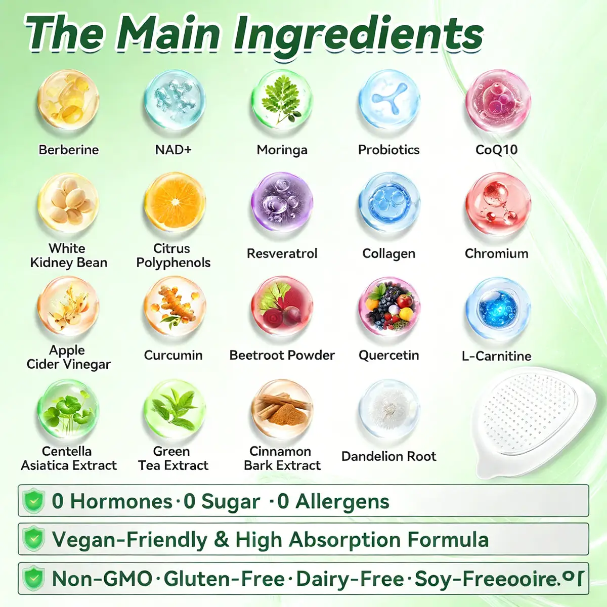 Benefits: Supports effective weight reduction and appetite regulation, stabilizes blood glucose levels, promotes cardiovascular health, reduces chronic low-grade inflammation, and helps alleviate metabolism-related fatigue.