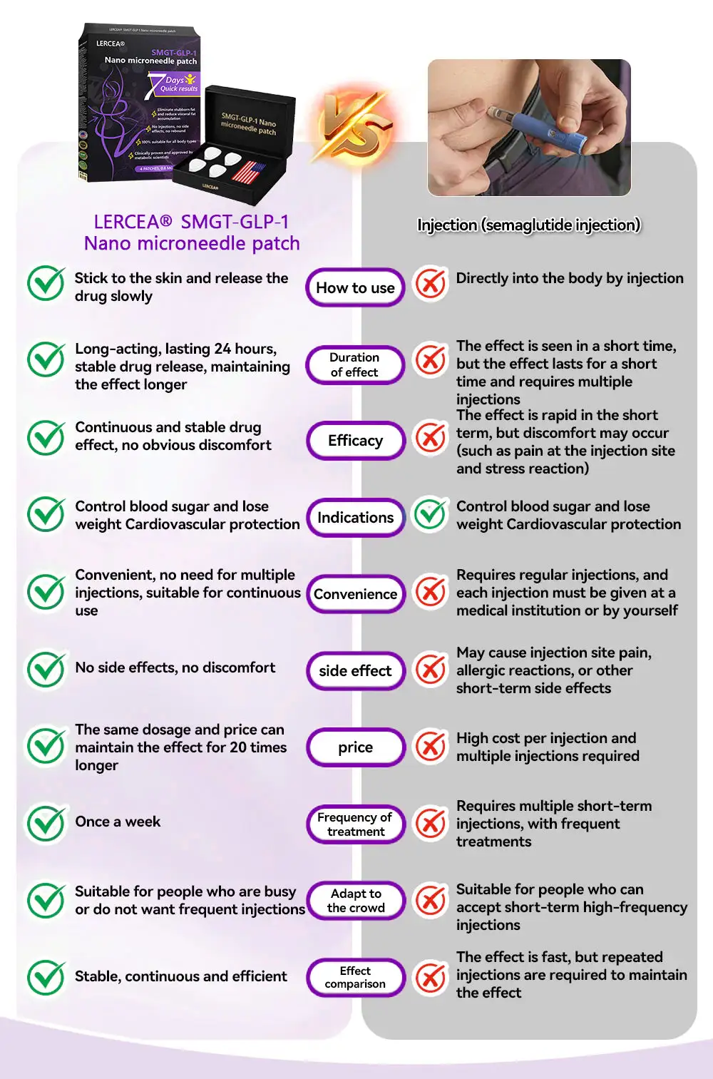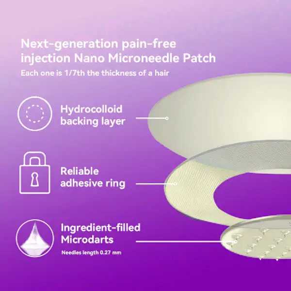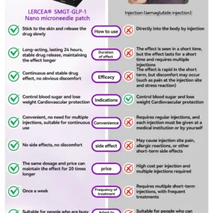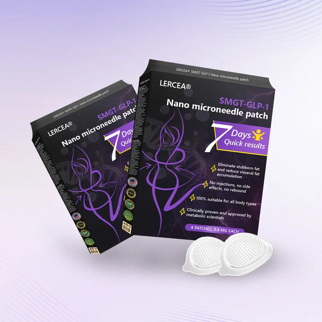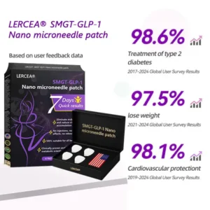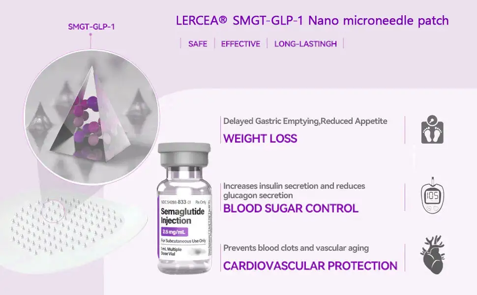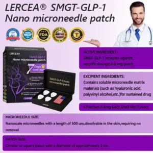 The Nano Microneedle Patch contains SMGT-GLP-1 in each patch. It works by mimicking the action of Glucagon-like Peptide-1 (GLP-1), promoting insulin secretion, inhibiting glucagon secretion, and delaying gastric emptying, which helps control blood sugar levels and aids in weight loss.