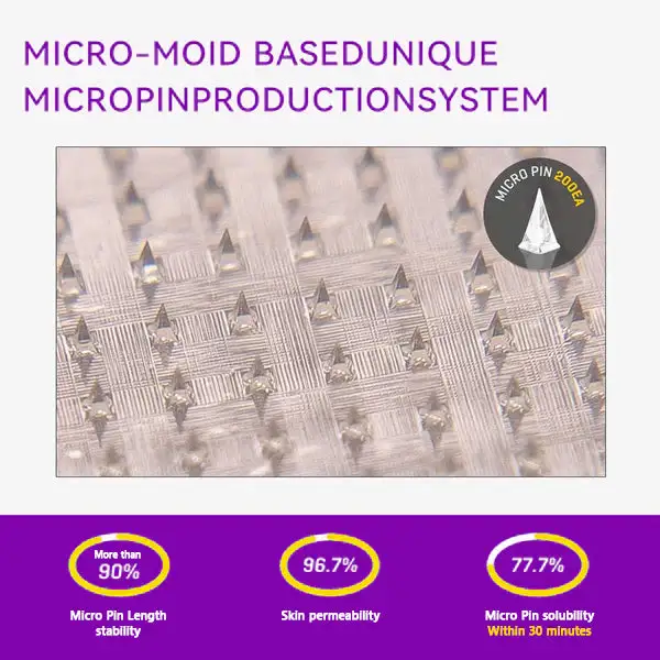Each needle is 0.27mm long, just 1/7th the thickness of a hair, and is made from dissolvable medication. These micro-needles are precision-engineered using cutting-edge manufacturing techniques to ensure a seamless, pain-free experience while effectively delivering the active ingredients directly into the skin.