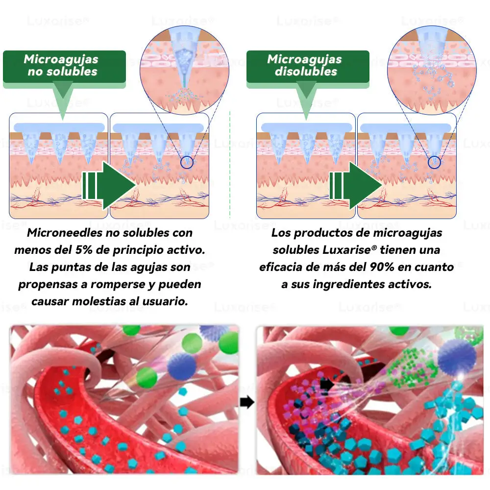 Nuestro parche de nanomicroagujas está dermatológicamente probado y diseñado con precisión para controlar la liberación transdérmica de ingredientes activos. Si bien la piel actúa naturalmente como una barrera protectora, este avanzado sistema de nanomicroagujas está especÃficamente diseñado para penetrar dicha barrera de forma segura y eficaz. Cada microaguja mide tan solo 0,27 mm de longitud (aproximadamente una séptima parte del grosor de un cabello humano) y está hecha de materiales bioactivos solubles , lo que garantiza una aplicación suave y prácticamente indolora, a la vez que libera los ingredientes directamente en la piel.