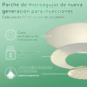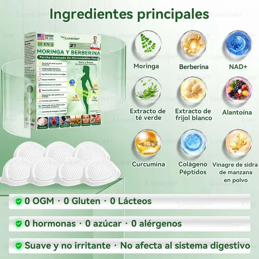 â  TecnologÃa de microagujas transdérmicas: A diferencia de los métodos tradicionales de inyección u orales para el control de peso, el sistema de administración transdérmica con nano-microagujas proporciona una liberación sostenida de ingredientes activos hasta por 8 horas. La moringa y la berberina favorecen sinérgicamente la regulación del apetito y el metabolismo de las grasas, haciendo que la pérdida de grasa sea más natural y sin esfuerzo. El NAD⺠mantiene los niveles de energÃa y la firmeza de la piel. Su fórmula suave y estable ofrece una experiencia de control de peso cómoda y sin irritaciones.