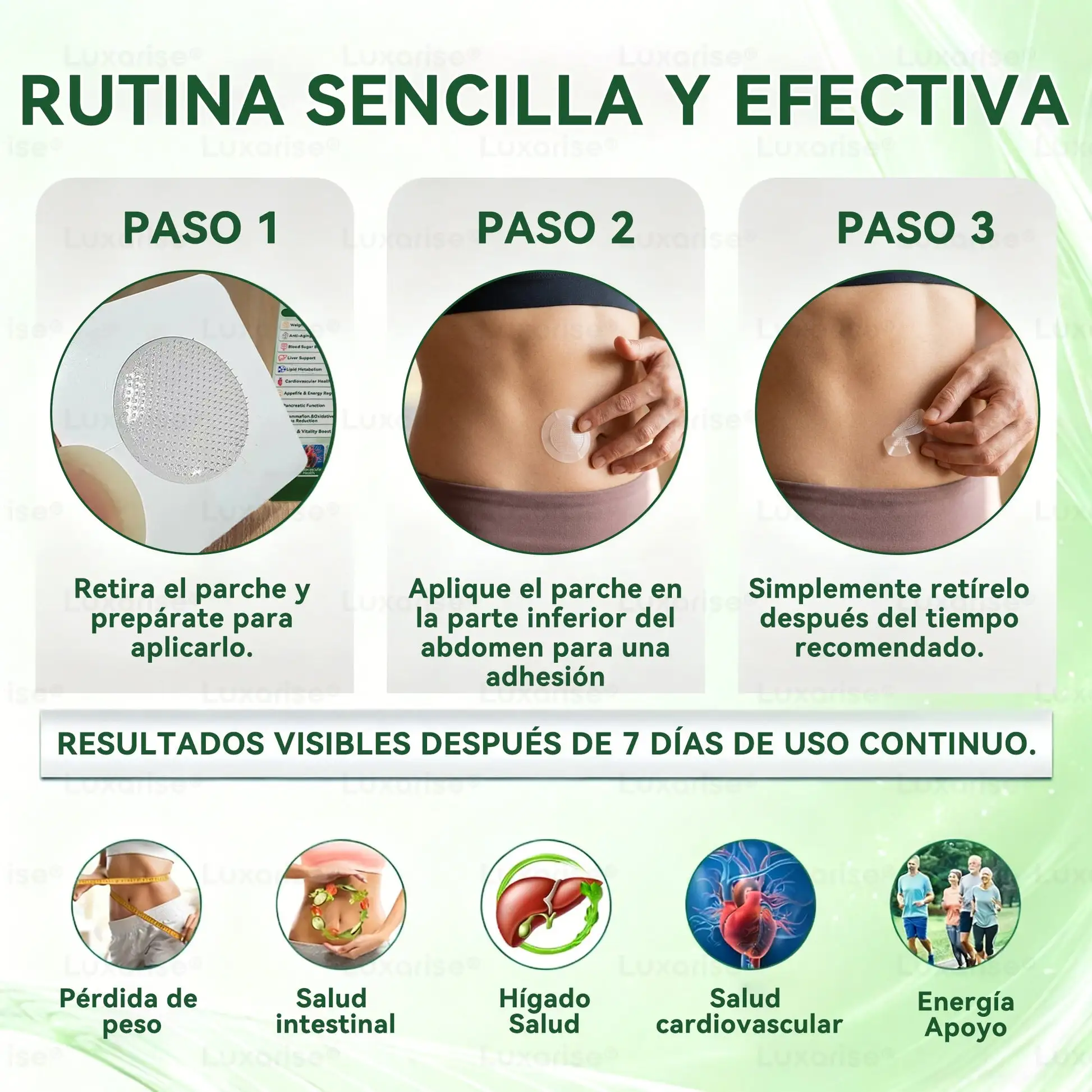 Este parche 100 % natural, formulado cientÃficamente, está diseñado para que todos los ingredientes activos actúen sinérgicamente sin interferencias. Al evitar el paso por el sistema digestivo, se puede usar de forma segura junto con las comidas y productos de rutina. Es apto para veganos, ofrece una alta absorción transdérmica y no contiene hormonas, azúcares ni ingredientes alergénicos. No contiene OGM, gluten, soja, colorantes, fragancias ni conservantes artificiales.