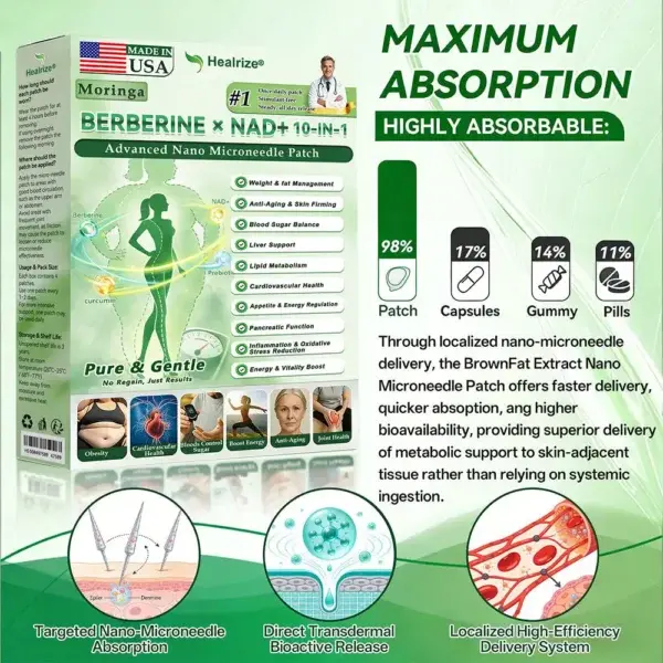 Through localized nano-microneedle delivery, theย BrownFat Extract Nano Microneedle Patchย supports glucose regulation and metabolic efficiency by targeting skin-adjacent metabolic tissue rather than relying on systemic ingestion. Bioactive compounds such as cinnamon polyphenols, berberine, and green tea EGCG modulate glucose uptake and utilization at the tissue level, helping attenuate post-meal glucose fluctuations and improve metabolic flexibility. By supporting insulin sensitivity and promoting more efficient hepatic glucose handling, the patch contributes to steadier energy release and reduced glycemic volatility throughout the day. In parallel, activation of brown adiposeโassociated pathways enhances mitochondrial fuel utilization, shifting excess glucose and fatty acids toward energy dissipation rather than storage. With consistent use, this localized, multi-pathway approach supports improved glucose stability, enhanced insulin responsiveness, more efficient energy metabolism, and smoother, more controlled glycemic patternsโwithout sharp spikes or crashes.