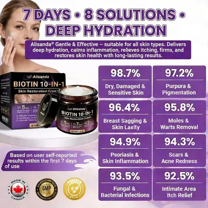 Therefore, Alisanda® Biotin 10-in-1 Skin Restoration Cream was scientifically developed under rigorous standards. Its formula combines the restorative power of natural biotin and collagen, synergized with hyaluronic acid, vitamin C, centella asiatica, and over ten other potent bioactive ingredients. Together, they deliver multi-dimensional care — from deep hydration and barrier repair to anti-inflammatory relief, itch control, metabolic renewal, tissue restoration, and anti-aging nourishment. Clinically validated and produced in GMP-certified facilities compliant with Canadian safety standards, this cream offers a safe, effective, and drug-free multi-repair skincare solution for dryness, inflammation, irritation, and signs of aging — restoring comfort, resilience, and lasting skin health.