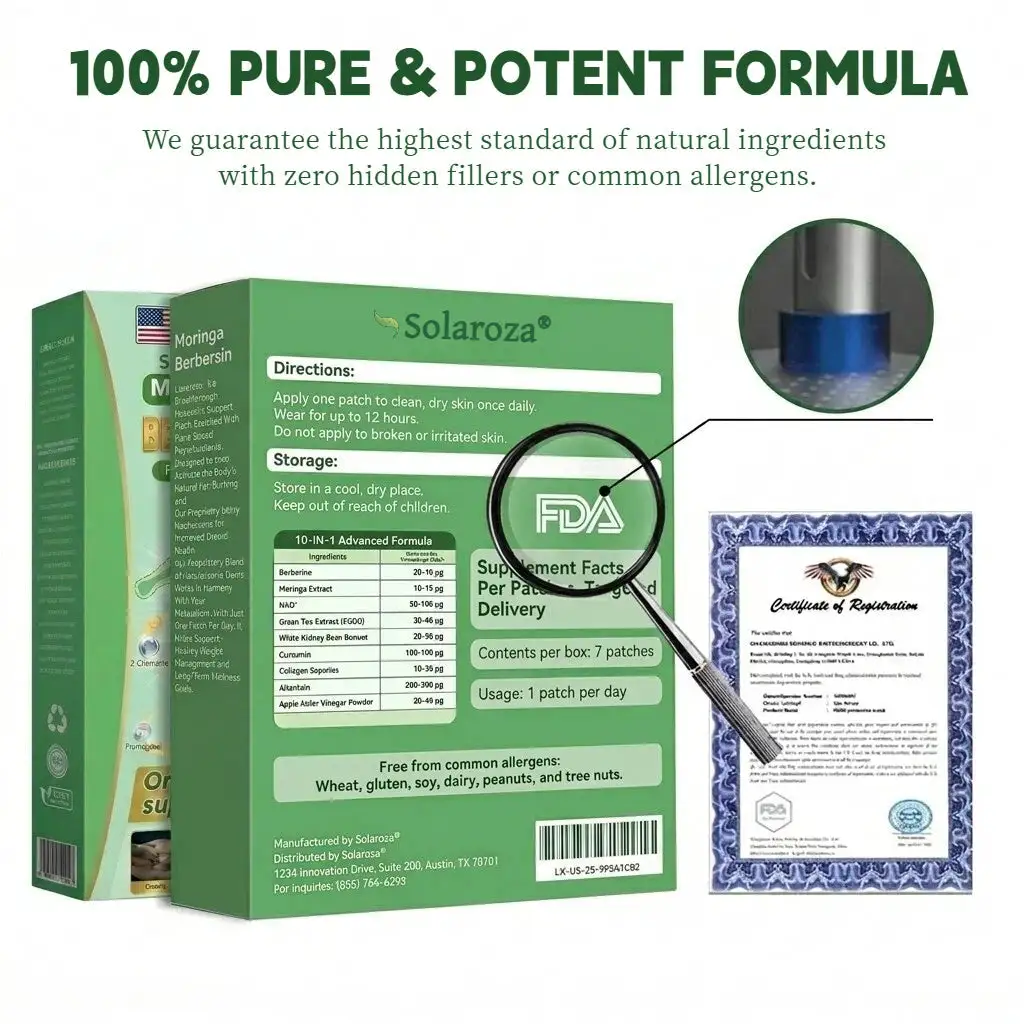 CLINICALLY TESTED BY ENDOCRINOLOGY EXPERTSThe Solaroza® Moringa & Berberine 10-IN-1 Advanced Nano Microneedle Patch features a new natural formula with upgraded multi-pathway metabolic support, designed to help regulate appetite, improve metabolic efficiency, and support sustainable weight management.