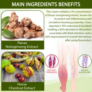 This cream features 3% Panax Notoginseng Extract and 2% Horse Chestnut Extract, known for their ability to reduce swelling and improve circulation. In clinical observations, 65% of individuals noted a marked reduction in localized swelling, while 70% reported improvements in skin texture and tone.