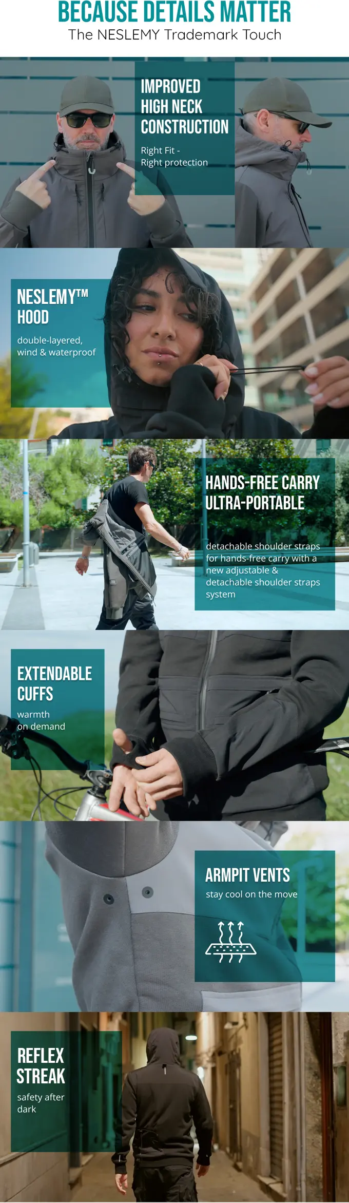 100% regenerated nylon panels for waterproof, windproof, and tear-resistant protection
