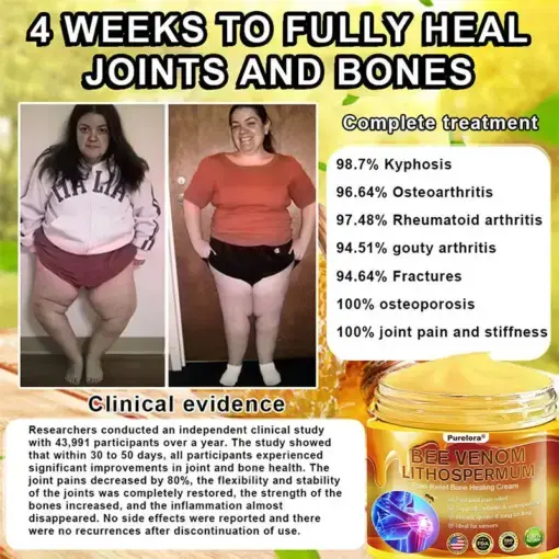 Purelora BEE VENOM LITHOSPERMUM Pain-Relief Bone Healing Cream This product is certified and recommended by FDA, meeting their high standards to effectively relieve pain and promote bone health. Approved by orthopedic doctors, it relieves pain within 5 minutes, restores joint mobility in 7 days, and significantly improves arthritis symptoms in 4 weeks. Choose our BEE VENOM LITHOSPERMUM Pain-Relief Bone Healing Cream and enjoy reliable results and a pleasant experience with confidence.