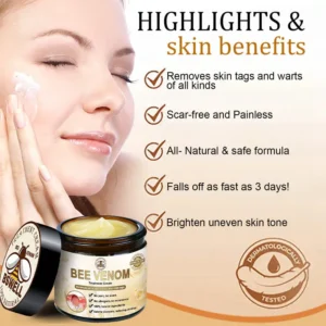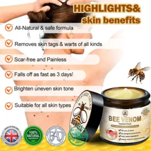 Another significant advantage of bee venom is its ability to enhance blood circulation. By increasing blood flow in the targeted area, it aids in the elimination of skin tags and warts while promoting tissue regeneration and speeding up the healing process. This not only helps in restoring but also revitalizing damaged tissues. Furthermore, regular use of the cream can lead to smoother and healthier skin over time.