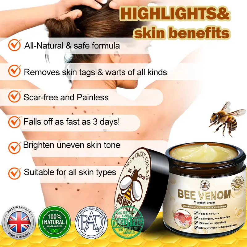 𝑩𝑺𝑾𝑬𝑳𝑳™ 𝐁𝐞𝐞 𝐕𝐞𝐧𝐨𝑚 𝐓𝐫𝐞𝐚𝑡𝑚𝑒𝑛𝑡 𝐂𝐫𝐞𝐚𝑚 provides an effective solution by utilizing the potent properties of bee venom to target various skin imperfections such as skin tags, moles, warts, and blemishes. Infused with active ingredients derived from bee venom, this sophisticated formulation works to dissolve and gently remove unwanted growths.