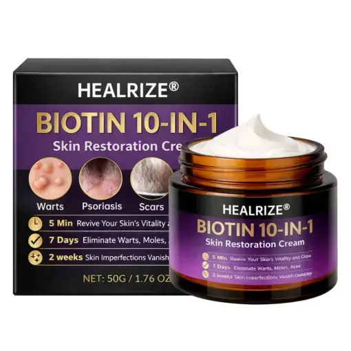 Healrize® Biotin 10-in-1 Skin Restoration Cream combines Biotin with a high-performance skincare complex to help refresh and repair the look of skin. It supports elasticity, improves the appearance of fine lines, and enhances the look of texture and tone. Designed to be up to 20× more concentrated than traditional skincare (based on formula potency), it delivers hydration and helps support collagen for firmer-looking skin. Produced to U.S. and EU quality standards for safe, non-invasive daily use.