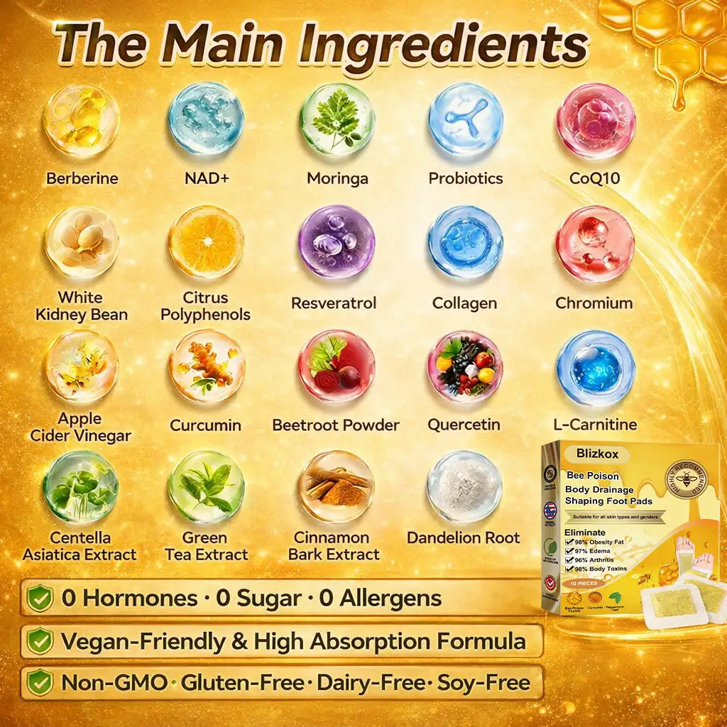 Blizkox™ 𝑳𝒚𝒎𝒑𝒉𝒂𝒕𝒊𝒄 𝑫𝒓𝒂𝒊𝒏𝒂𝒈𝒆 · 𝑫𝒆𝒕𝒐𝒙 × 𝑺𝒍𝒊𝒎𝒎𝒊𝒏𝒈 𝟏𝟎-𝐢𝐧-𝟏 𝗔𝗱𝘃𝗮𝗻𝗰𝙚𝙙 𝙉𝙞𝙜𝙝𝙩 𝘼𝙘𝙩𝙞𝙫𝙚 𝐅𝐨𝐨𝐭 𝐏𝐚𝐝𝐬 was developed through more than 20 years of research by a multidisciplinary team of over 30 experts. Each patch incorporates an ultra-fine microneedle architecture measuring approximately one-seventh the thickness of a human hair, designed to ensure a smooth and virtually painless application. The formulation contains highly concentrated natural bioactive compounds, up to 20-fold higher than conventional market levels, including Moringa and Berberine, which act synergistically to support healthy glycemic responses, appetite regulation, and lipid metabolism, thereby promoting gradual and sustainable weight management. Enriched with NAD+, the patch further supports skin firmness and structural resilience during body-weight fluctuations, helping maintain a lean appearance without compromising comfort or aesthetics. Additional high-efficacy components contribute to the support of immune function, digestive health, gut balance, women’s health, daily energy levels, and fatigue reduction, collectively promoting a more youthful and resilient physiological state from within. Manufactured in facilities that comply with both U.S. and EU quality standards, this needle-free, science-driven solution provides a safe and comprehensive approach to effective weight management and long-term metabolic health, designed to work in harmony with the body rather than against it.