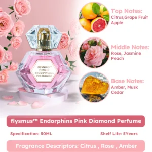 flysmus™ Endorphins Pink Diamond Perfume enables users to emit subtle attraction cues. Endorphin molecules diffuse across synapses, binding to receptors, triggering neural activity shifts, affecting motivation and reward, inciting positive emotions, and radiating charisma. The scent captivates friends, heightening their senses, and naturally drawing them to the user.