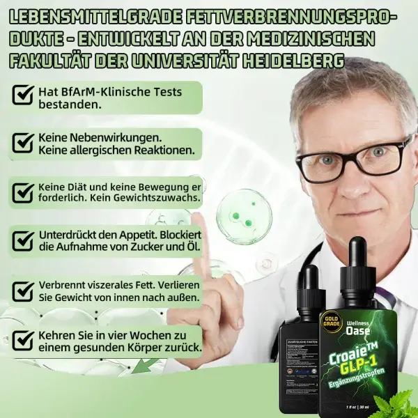 Es ist perfekt für jeden, der fettleibigkeitsbedingte Probleme angehen muss, und ich kann es absolut empfehlen. Eine Flasche der Croaie™ GLP-1-Ergänzungstropfen liefert mehr Vorteile als 15 Tage konsequentes Training. Dies ist ein brandneuer Durchbruch in der Behandlung von Fettleibigkeit weltweit!“ — Dr. Georg W. Ziegenhorn
