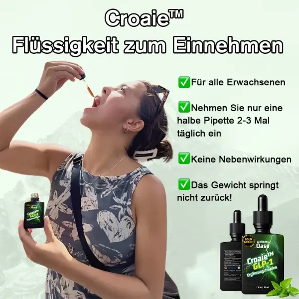 Croaie™ GLP-1-Ergänzungstropfen ist für alle Erwachsenen geeignet und kann in einer Menge von nur einem halben Tropfenzähler 2-3 Mal täglich eingenommen werden. Keine Nebenwirkungen! Das Gewicht wird nicht wieder zunehmen!