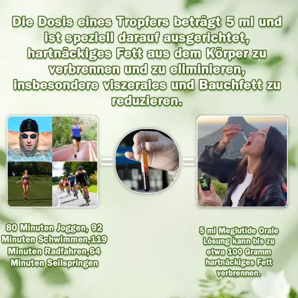 Studien haben gezeigt, dass 5 ml der Meglutide Oral Solution bis zu etwa 100 Gramm hartnäckiges Fett verbrennen können. Und es dauert eine lange Zeit, um 50 Gramm Fett durch Sport zu verbrennen (80 Minuten Joggen, 92 Minuten Schwimmen, 119 Minuten Radfahren, 64 Minuten Seilspringen). Die Dosis eines Tropfers beträgt 5 ml und ist speziell darauf ausgerichtet, hartnäckiges Fett aus dem Körper zu verbrennen und zu eliminieren, wobei sie besonders effektiv bei der Reduktion von viszeralem und abdominalem Fett ist.