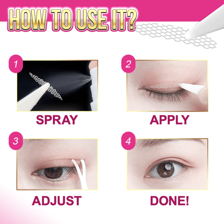 The double-lid tapes feature a water-activated, ultra-strong adhesion that lasts for an amazing 24 hours or longer. They can even withstand exposure to water, rain, sweat and other liquids without repositioning or causing even a single slip. What’s more? All eyelid stickers are breathable and light to ensure that they can stay secured for a prolonged period without irritation or discomfort. Simply peel-off the sticker from the film, spray with water to activate adhesion, apply it on top of the lids to create a stunning double-lid fold, and done. Perfect for those with monolids eye, hooded, saggy lids, uneven eyelids, inner double eyelids, and thin double eyelids.