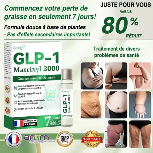 CROAIE® Gouttes Minceur & Santé GLP-1 & Matrixyl 3000 ont été développées par une équipe de plus de 30 experts internationaux en endocrinologie et diabétologie après plus de 3 ans de recherche. Elles combinent le tirzépatide avec de puissants ingrédients végétaux pour stimuler le métabolisme, accélérer la combustion des graisses et soutenir la santé digestive ainsi que lymphatique. Cette solution orale a été approuvée par l’ANSM (Agence nationale de sécurité du médicament et des produits de santé) pour sa sécurité et son efficacité, offrant une solution scientifiquement fondée pour la perte de poids et le bien-être global.