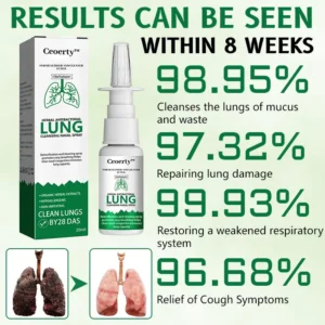 Ceoerty™ Herbal Antibacterial Lung Cleansing Nasal Spray is your go-to solution for clearing mucus and toxins from the lungs and upper airways. Over 8 weeks, it helps to thoroughly cleanse and repair lung damage caused by allergies, asthma, dust, and smoking, restoring strength to a compromised respiratory system. It also helps to relieve symptoms related to lung coughs, including those associated with COVID-19.