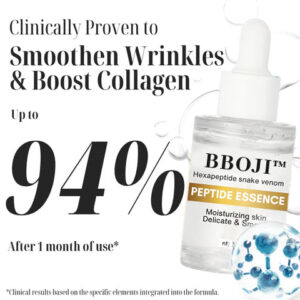 BBOJI™ Hexapeptide Snake Venom Peptide Essence harnesses the power of snake venom, a groundbreaking ingredient in the world of skincare. Clinically studied and proven to reverse the signs of aging, snake venom contains potent bioactive compounds that work in harmony with the skin’s natural processes to deliver remarkable anti-aging benefits.