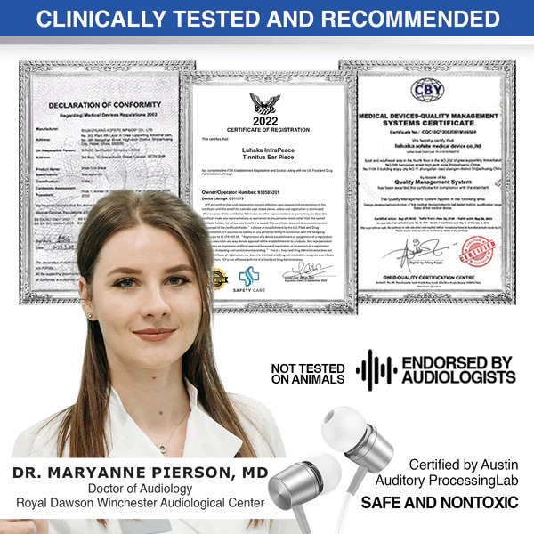 “LUHAKA™  Infrapeace is made to tackle tinnitus at its root. The laboratory tested Low Level Laser Therapy repairs damaged tissues in inner ear and stops the damaged tissues sending phantom signals to the brain.  says Dr. Anastasia Sanford, Au.D., an audiologist at Royal Dawson Winchester Audiological Center in Massachusetts, one of the thousands of audiologists who considered InfraPeace to be one of the most effective over-the-counter solutions to soothe tinnitus.
