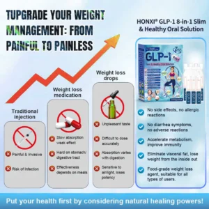 Honxi® Longevity Mix GLP-1 8-in-1 Slim & Healthy Oral Solution, developed from 20+ years of research by 30+ experts, is designed for middle-aged and older adults. It combines Tirzepatide(GLP-1) with natural extracts to balance blood sugar, curb appetite, and burn fat for gradual, healthy weight loss. With added Collagen Peptides, it supports skin firmness during slimming. Made in GMP-certified facilities under U.S. and EU standards, it provides a safe, science-backed, needle-free solution for effective weight management and lasting health.
