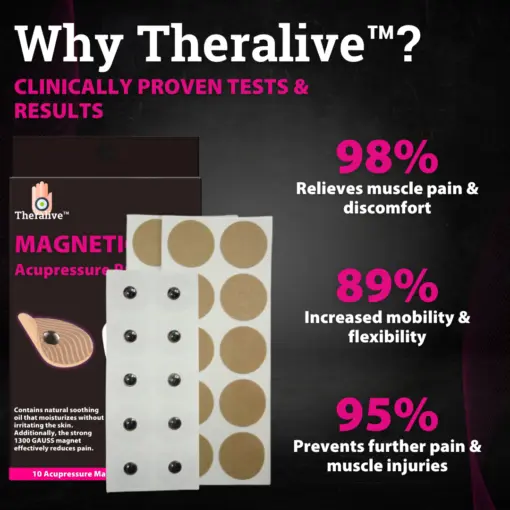 Experience the benefits of both acupressure and magnetic therapy with Theralive™ Magnetic Acupressure Patches, and take a proactive approach to pain relief and muscle health.