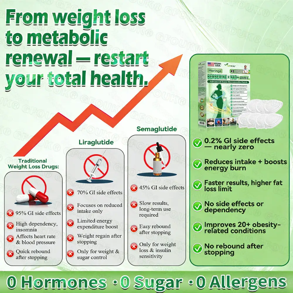 ✅ 𝐆𝐅𝐎𝐔𝐊®𝑴𝒐𝒓𝒊𝒏𝒈𝗮 · 𝗕𝗲𝗿𝗯𝗲𝗿𝙞𝙣𝙚 × 𝙉𝘼𝐃+ 𝟏𝟎-𝐢𝐧-𝟏 𝗔𝗱𝘃𝗮𝗻𝗰𝙚𝙙 𝙉𝙖𝙣𝙤 𝙈𝙞𝙘𝙧𝙤𝙣𝙚𝙚𝐝𝐥𝐞 𝐏𝐚𝐭𝙘𝙝 breaking away from the burden of traditional injectable or oral weight-loss products, this advanced nano microneedle transdermal delivery system gently and steadily releases active ingredients for up to 8 hours. Core ingredients Moringa and Berberine work synergistically to support appetite management and lipid metabolism, making fat loss feel more natural and effortless—without extreme dieting or physical strain. At the same time, NAD⁺ supports cellular energy levels and skin firmness, helping maintain a healthy, well-toned appearance during body-weight changes. The overall formula is gentle and stable, offering a more comfortable experience for those seeking an effective, non-irritating, and non-injectable approach to weight management.