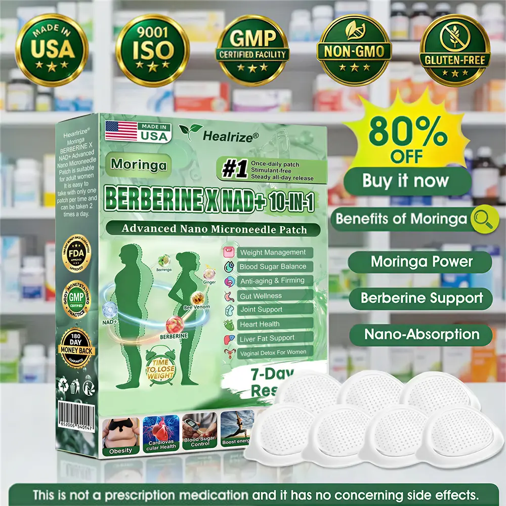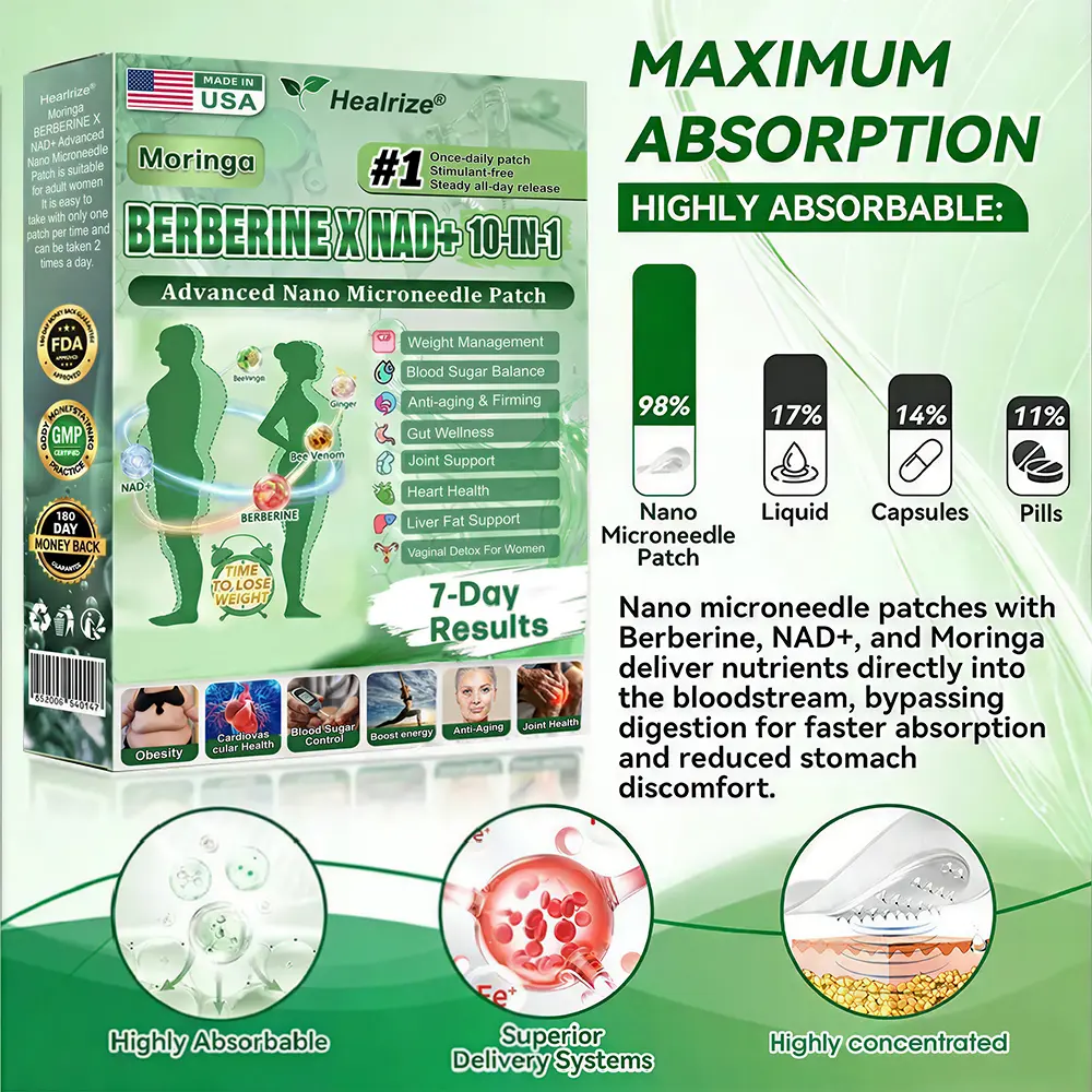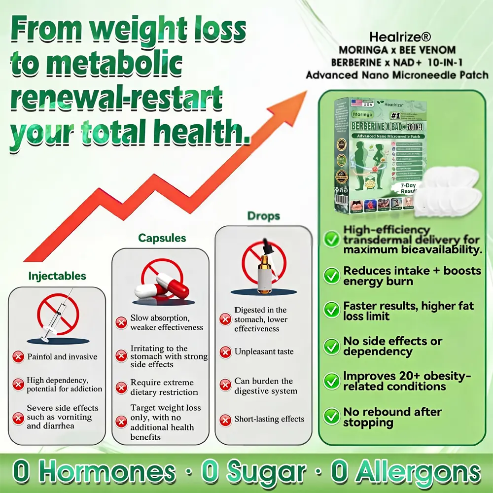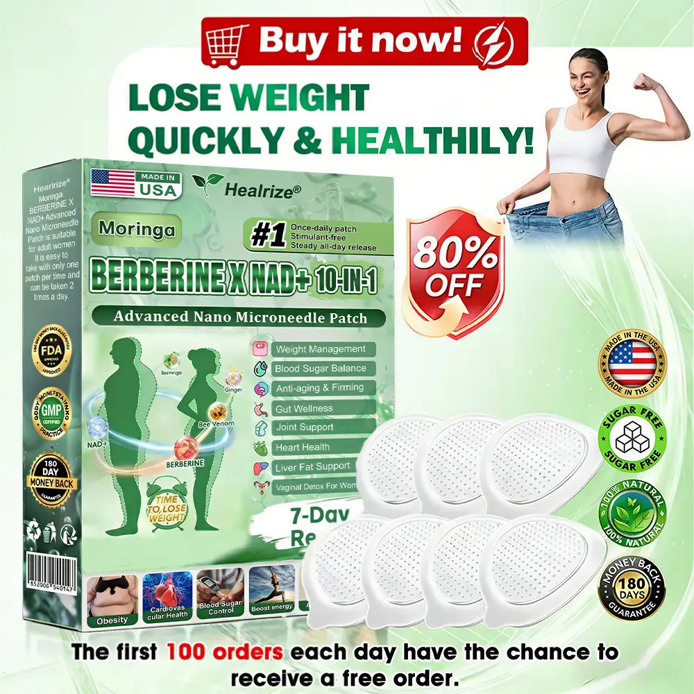 ✅ Healrize®𝐌𝐨𝐫𝐢𝐧𝐠𝐚 · 𝐁𝐞𝐞 𝐯𝐞𝐧𝐨𝐦 · 𝐁𝐞𝐫𝐛𝐞𝐫𝐢𝐧𝐞 × 𝐍𝐀𝐃+ 10-𝐢𝐧-𝟏 𝐀𝐝𝐯𝐚𝐧𝐜𝐞𝐝 𝐍𝐚𝐧𝐨 𝐌𝐢𝐜𝐫𝐨𝐧𝐞𝐞𝐝𝐥𝐞 𝐏𝐚𝐭𝐜𝐡 breaking away from the burden of traditional injectable or oral weight-loss products, this advanced nano microneedle transdermal delivery system gently and steadily releases active ingredients for up to 8 hours. Core ingredients Moringa and Berberine work synergistically to support appetite management and lipid metabolism, making fat loss feel more natural and effortless—without extreme dieting or physical strain. At the same time, NAD⁺ supports cellular energy levels and skin firmness, helping maintain a healthy, well-toned appearance during body-weight changes. The overall formula is gentle and stable, offering a more comfortable experience for those seeking an effective, non-irritating, and non-injectable approach to weight management.