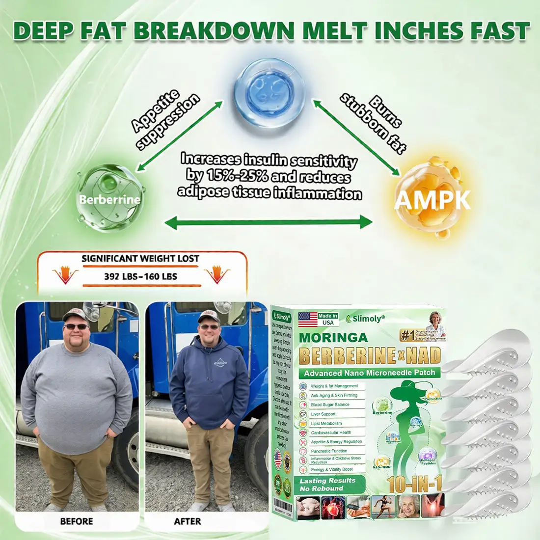 Clinically tested by endocrinology experts, the Slimoly® 𝑴𝒐𝒓𝒊𝒏𝒈𝗮 · 𝗕𝗲𝗿𝗯𝗲𝗿𝙞𝙣𝙚 × 𝙉𝘼𝐃+ 𝟏𝟎-𝐢𝐧-𝟏 𝗔𝗱𝘃𝗮𝗻𝗰𝙚𝙙 𝙉𝙖𝙣𝙤 𝙈𝙞𝙘𝙧𝙤𝙣𝙚𝙚𝐝𝐥𝐞 𝐏𝐚𝐭𝙘𝙝 features a brand-new, natural formula with triple-strength upgrades.Clinically noticeable improvements in 7 days — no rebound effect.