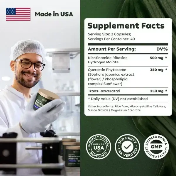 Fight skin aging and boost energy with our Liposomal Nicotinamide Riboside, Resveratrol, and Quercetin capsules. Absorb NAD precursors more effectively than NMN supplements.