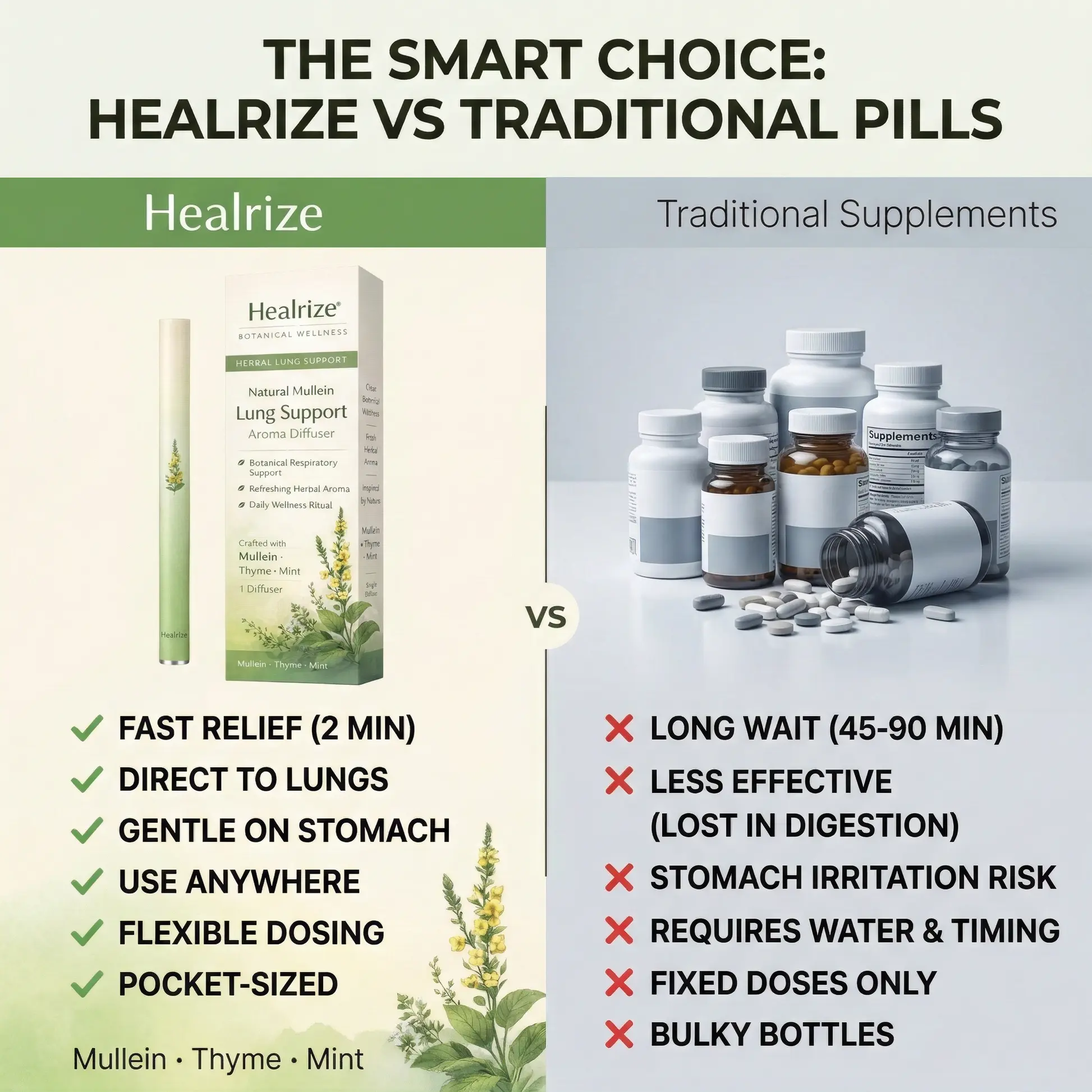 Traditional oral supplements deliver only 20-40% of active compounds to your lungs after passing through your digestive tract. Healrize® Botanical LungCare Mullein Diffuser technology delivers 90-100% bioavailability directly to your respiratory system within 2 minutes.