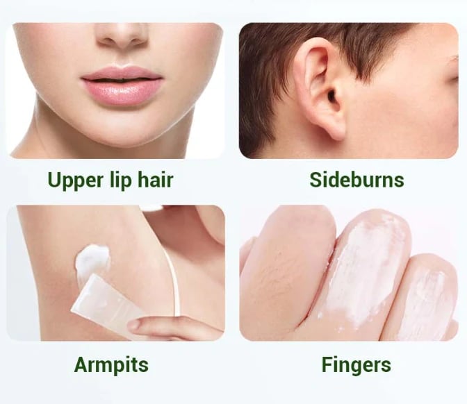 Achieve smooth, hair-free skin quickly! This hair removal cream is perfect for sensitive areas like the upper lip, thick eyebrows, fingers, and fine peach fuzz, offering painless results.