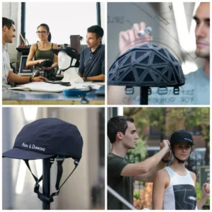 The Park & Diamond helmet was designed using patented and proprietary protection materials that are significantly more efficient at absorbing and dissipating energy than traditional bike helmets, It folds/rolls-up into a unique cylindrical case, and has washable and interchangeable skins.