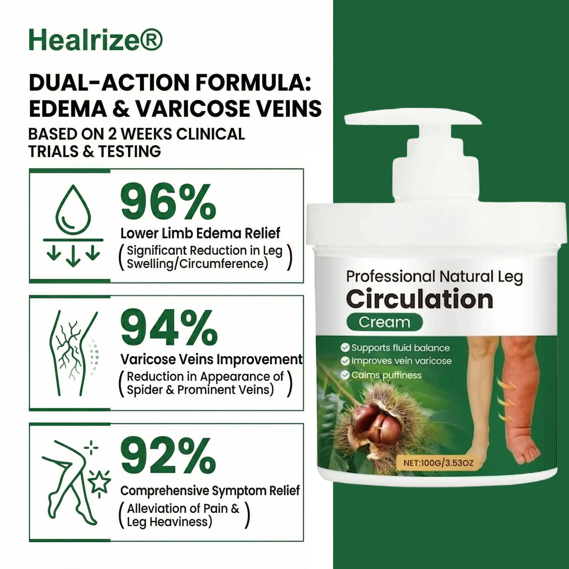 [Dr. Emily Carter], Senior Vascular Surgeon “In my daily clinical practice, I frequently treat patients suffering from excessive venous pressure, puffiness, and varicose veins caused by prolonged sitting or standing. In addition to standard medical interventions, I often recommend topical treatments containing horse chestnut extract. Healrize® Leg Circulation Cream harnesses this time-tested natural botanical extract. It penetrates effectively to help constrict dilated blood vessels and promote healthy microcirculation. For anyone looking to gently alleviate leg heaviness and restore smooth skin in their daily routine, this is a scientifically-backed and safe choice.”