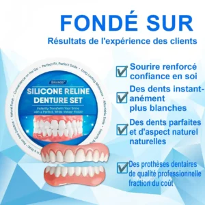 - Ajustement personnalisable : le regarnissage en silicone sur mesure s’adapte parfaitement à vos prothèses dentaires.