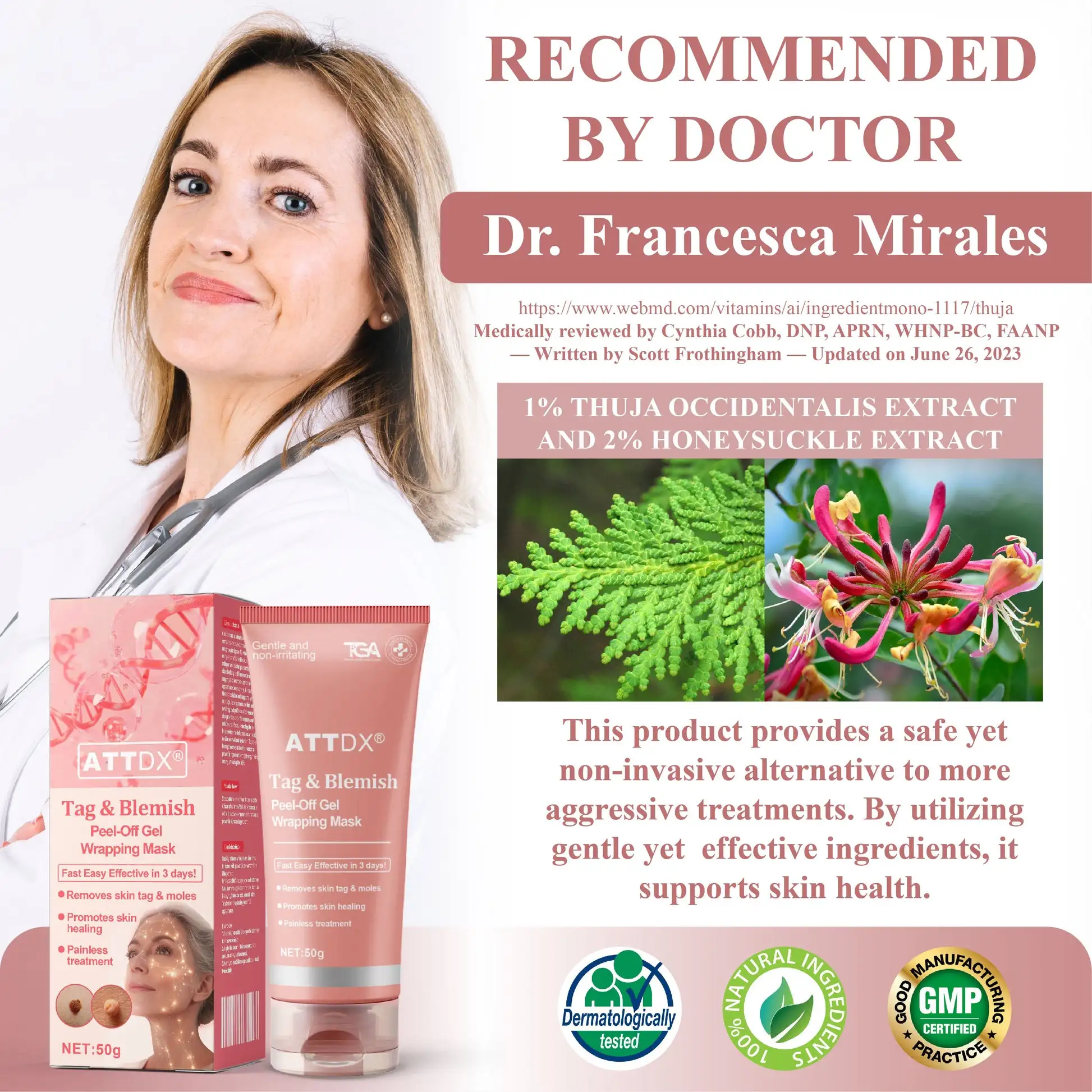 ATTDX® Tag & Blemish Peel-Off Gel Wrapping Mask, formulated with 1% Thuja Occidentalis Extract and 2% Honeysuckle Extract, has shown promising results in addressing skin tags and blemishes.