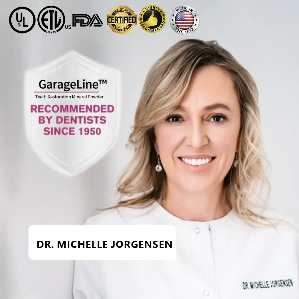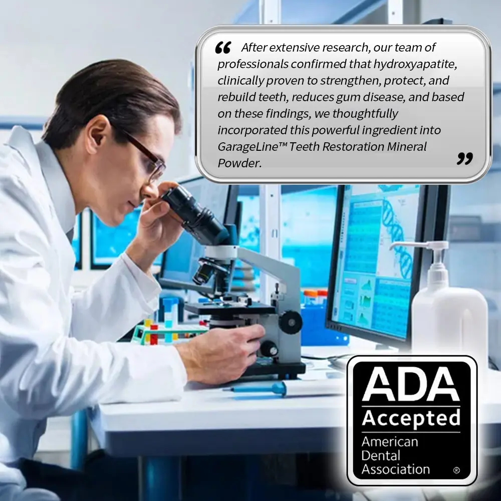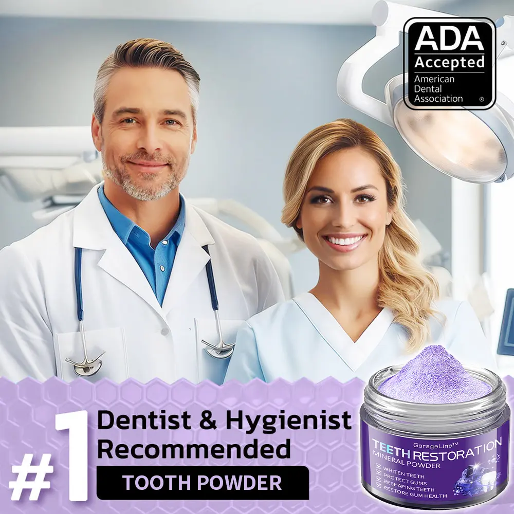 GarageLine™ Teeth Restoration Mineral Powder eradicates 99.99% of bacteria, eliminates bad breath, removes plaque and tartar, treats gingivitis and periodontitis, alleviates toothache, prevents and heals cavities, restores tooth enamel, stimulates reparative dentin formation, and supports the regeneration of lost teeth.