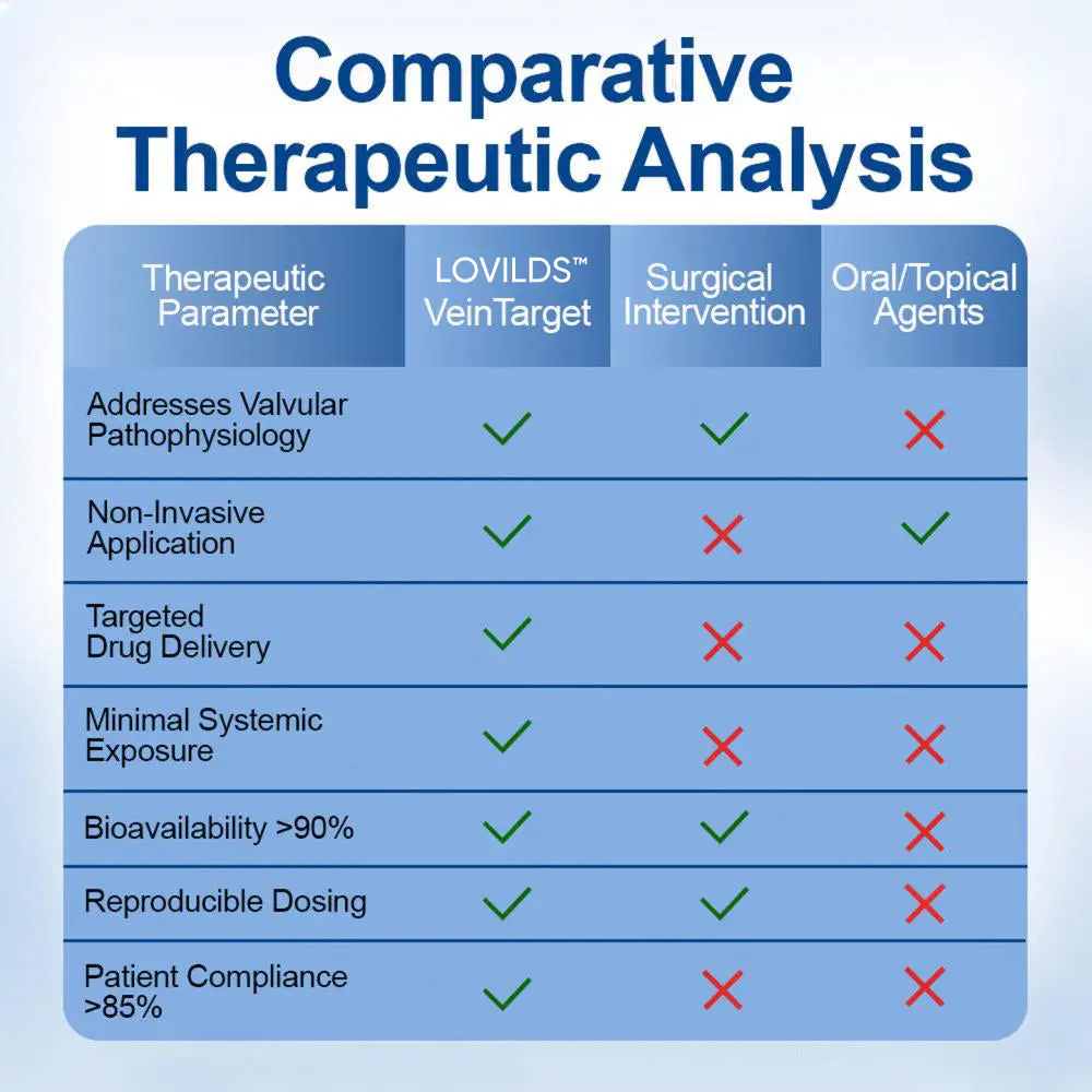 LOVILDS™ VeinEase represents the first commercially available transdermal phytotherapy system specifically designed to address venous valvular insufficiency through localized botanical intervention. Unlike systemic treatments that dilute active compounds throughout the circulatory system or topical applications that cannot penetrate the dermal barrier, our microneedle delivery system ensures concentrated therapeutic compounds reach the target tissue with minimal systemic exposure.