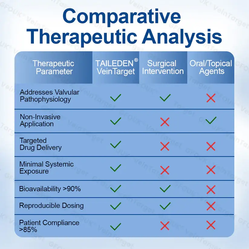 TAILEDEN® VeinTarget represents the first commercially available transdermal phytotherapy system specifically designed to address venous valvular insufficiency through localized botanical intervention. Unlike systemic treatments that dilute active compounds throughout the circulatory system or topical applications that cannot penetrate the dermal barrier, our microneedle delivery system ensures concentrated therapeutic compounds reach the target tissue with minimal systemic exposure.