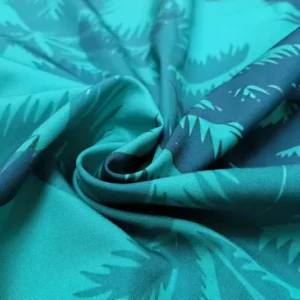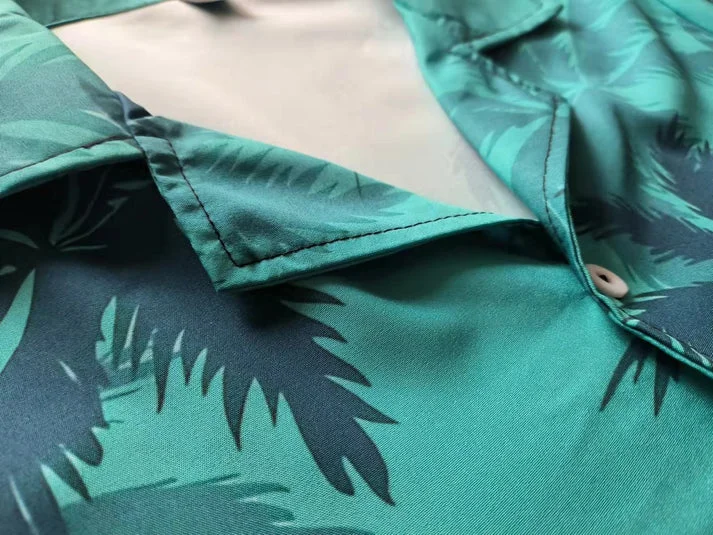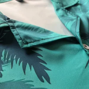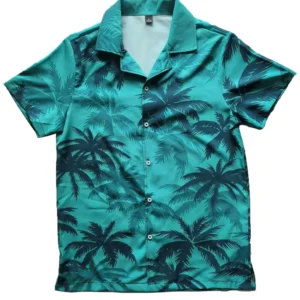 The shirt’s print includes images of palm trees, sunsets, and other tropical scenes, evoking the feeling of being on vacation.